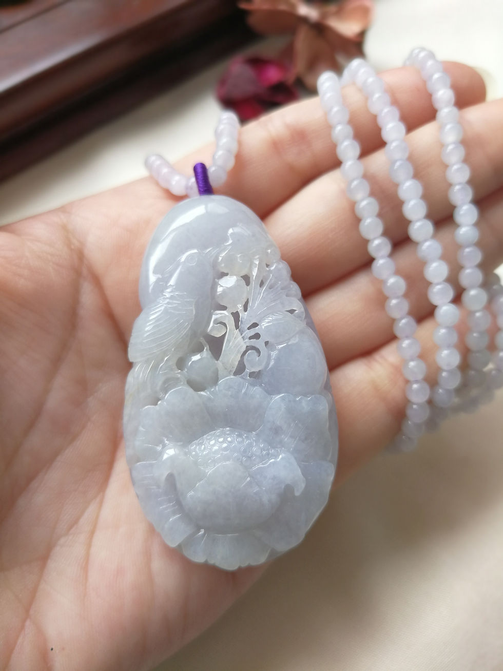 Icy Light Bluish Lavender Type A Natural Jadeite Jade Fei Cui Hollow carving wit